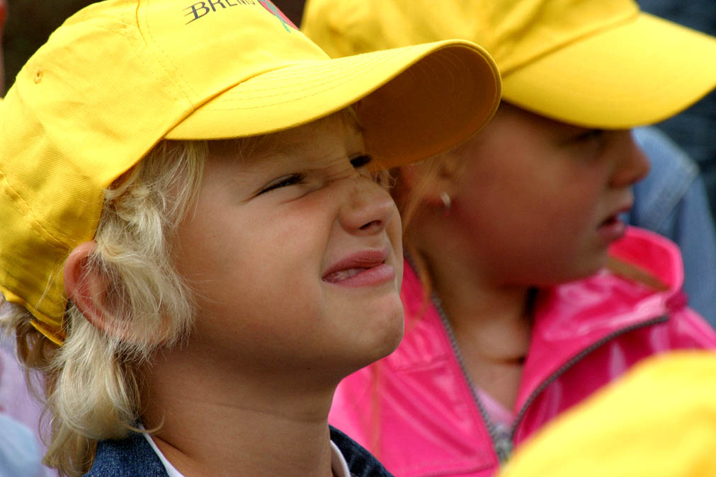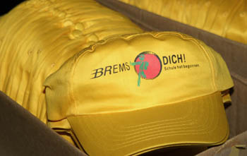 Die Kids tragen gelbe Kappen. Neben dem „Kleingedruckten“ (Schule hat begonnen) die Aufschrift: "Brems dich!" Ein Imperativ für die Autofahrer. Vielleicht aber auch für die Kollegen von der „ersten Bank“, denn auch die Neuen haben es auf dem Weg zur Schule (und erst recht, wenn’s nach Hause geht) gerne schon mal eilig.