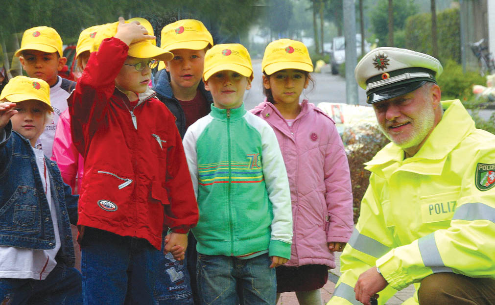 „Ich bin nicht dazu da, euch dazu zu bringen, dass ihr euren Spinat aufesst.“ Das Anti-Autoritätsprogramm eines Polizisten. Aber die gelbe Jacke mit der Aufschrift „Polizei“ tut trotzdem ihre Wirkung. Obwohl die I-Dötzchen der Karl-Leisner-Schule wahrscheinlich des Lesens noch nicht mächtig sind, reden sie den Erwin brav mit „Herr Polizist“ an. Herr Polizist soll den Neuschülern heute mal zeigen, wie man eine Fußgängerampel überquert. Okay: Nicht die Ampel. Die Straße. Präzision muss sein.