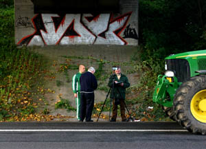 Geachtet wird auf alles, was sicherheitsrelevant ist: Ladungssicherung, technischer Zustand von Zugmaschine und Hänger, Bremsen, Reifen, Beleuchtung und Papiere. „Die Zeiten, in denen die Bauern ihre Rüben noch selbst mit dem Trecker nach Appeldorn brachten, sind ohnehin vorbei“, erklärt Wolfgang Manser. Heute sind Treckergespanne mit zwei Hängern eher die Ausnahme. Manser und seine Kollegen stoppen einen Laster aus Viersen. Die Ladung ist in Ordnung — nichts ist zu hoch aufgetürmt. Die Bremslichter sind sauber. (Was nützt ein Bremslicht, dass vor lauter Dreck nicht mehr zu sehen ist!)